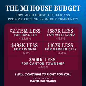 With weeks until the new fiscal year, the House Republican budget proposal guts funding for schools, first responders, working families, and more. While the budget plan my Senate Democratic colleagues and I passed back in May makes continued, bold investments in our students and classrooms, bolsters support for veterans and first responders who keep us safe, and lowers costs for families statewide, the Republican-led House proposal instead actively seeks to defund critical supports for Michiganders by:
